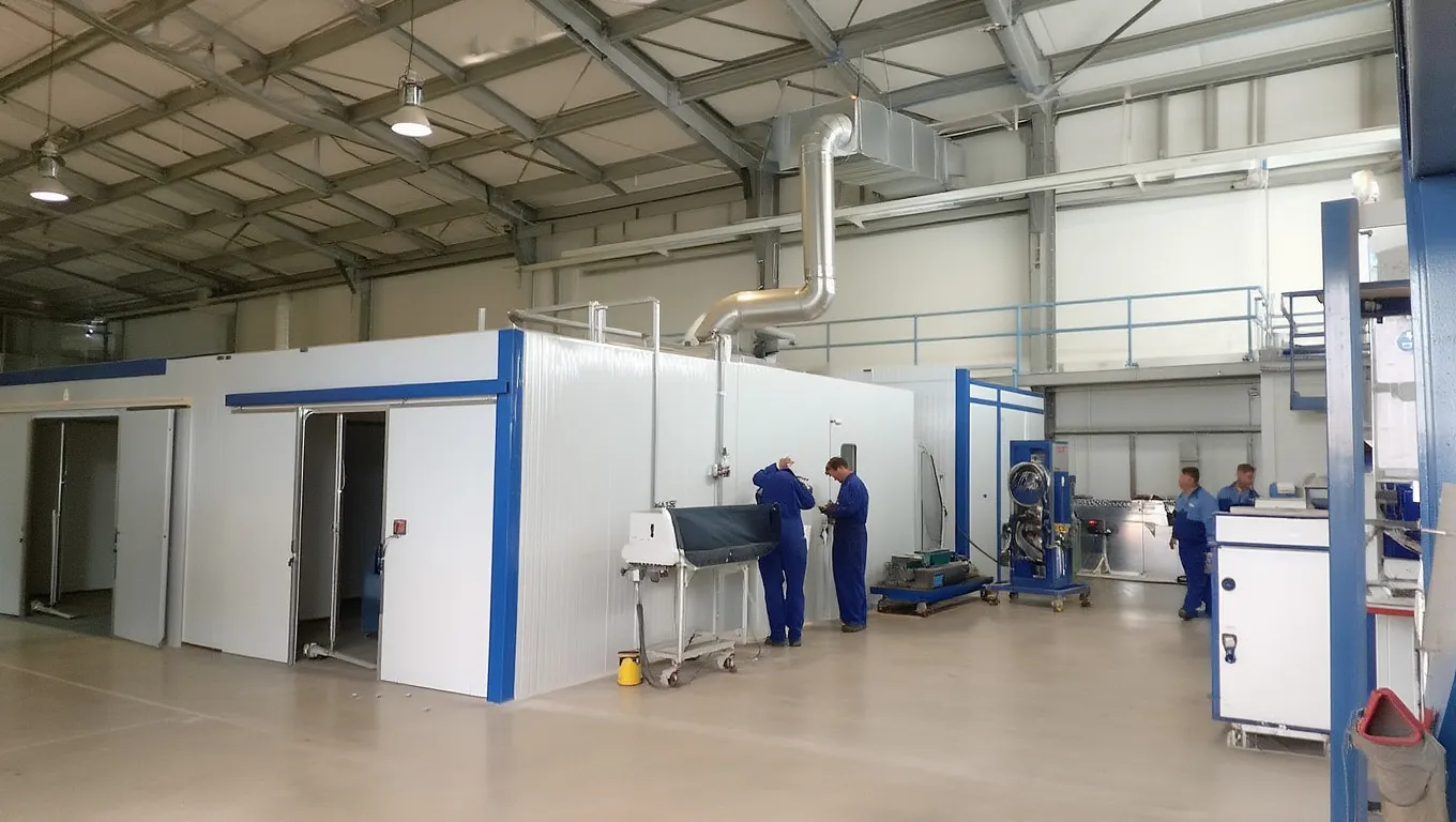 Обустройство линии порошковой окраски для металлических деталей и конструкций. Ангар обеспечивает необходимую герметичность и температурный режим для полимеризации покрытия. Предусмотрено место для подготовки изделий и контроля качества окраски.
